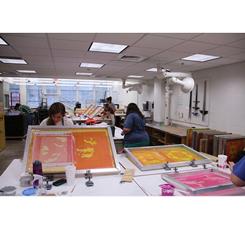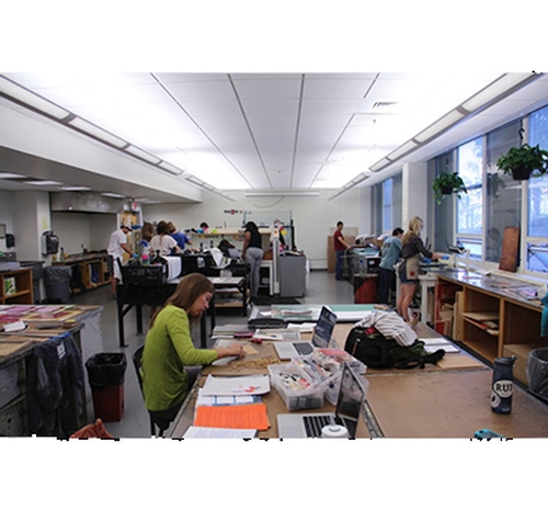Students studying printmaking work in well-equipped studios located on the lower level of Biggin Hall. Students work on two Charles Brand Etching Presses (36"x60" and 26"x40") and one Sturges Etching Press (30"x60"). The screen-printing area has 12 stations for printing, a 30"x40" NuArc exposure unit and a washout area. Advanced students work in a separate semi-private shared studio. Additionally printmaking students can take advantage of the large format Canon printer and Universal laser cutter on the first floor of Biggin Hall.